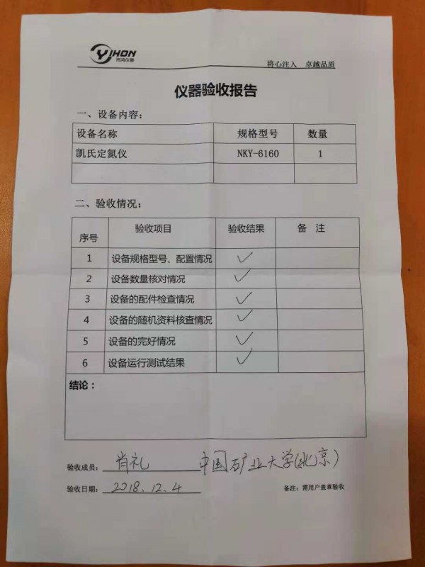 近期,上海祎鴻和中國礦業大學(北京)達成合作,產品凱氏定氮儀NKY-6160順利通過驗收。